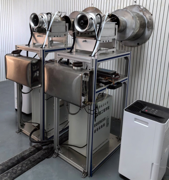 该试验台主要包括两套20kg级涡喷发动机部件及综合特性测试试验系统,系统组件包括布置好各相关参数的测量探头的JetCatP200RX涡喷发动机、发动机测试台架、排气管系统、测控系统及大屏幕显示器。试验台可实时测量发动机推力、转速、进气流量、燃油流量,以及5个截面上的压力、温度参数,可完成微小发动机压气机、涡轮特性分析实验,微小发动机燃烧特性实验,微小发动机综合性能试验。