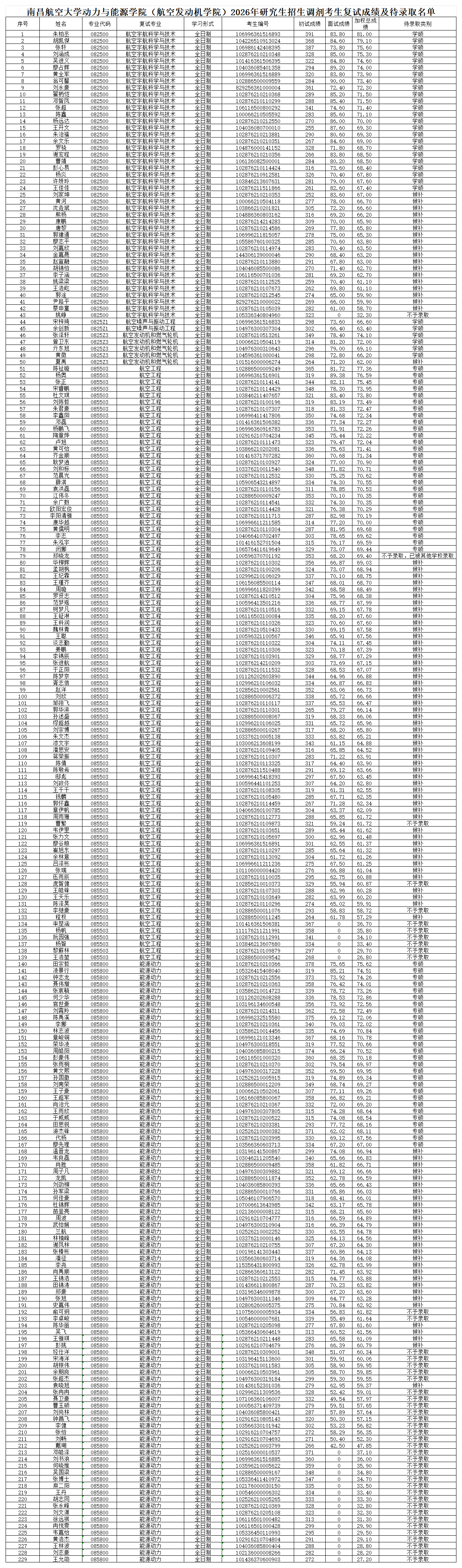 动力与能源学院(航空发动机学院)2026年研招调剂考生复试成绩及待录取名单